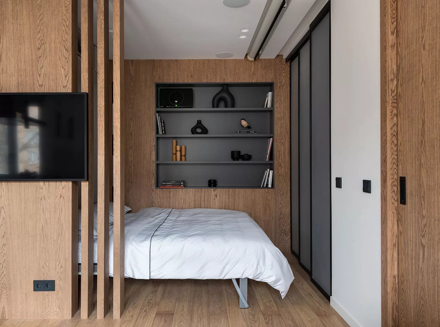 Для тех, у кого не так много места в спальне, больше подходят 3 последних вида перегородок, так как им не нужно отводить пространство под двери. Если размеры комнаты позволяют, распашные перегородки станут идеальной имитацией полноценной комнаты, отведенной под зону гардероба.